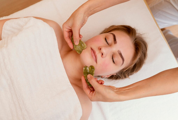 A person uses a smooth stone tool, which people normally make from jade or rose quartz, to move on their face by following designated facial pathways. The procedure helps to increase blood circulation while it also activates dormant qi energy and promotes lymphatic system drainage.